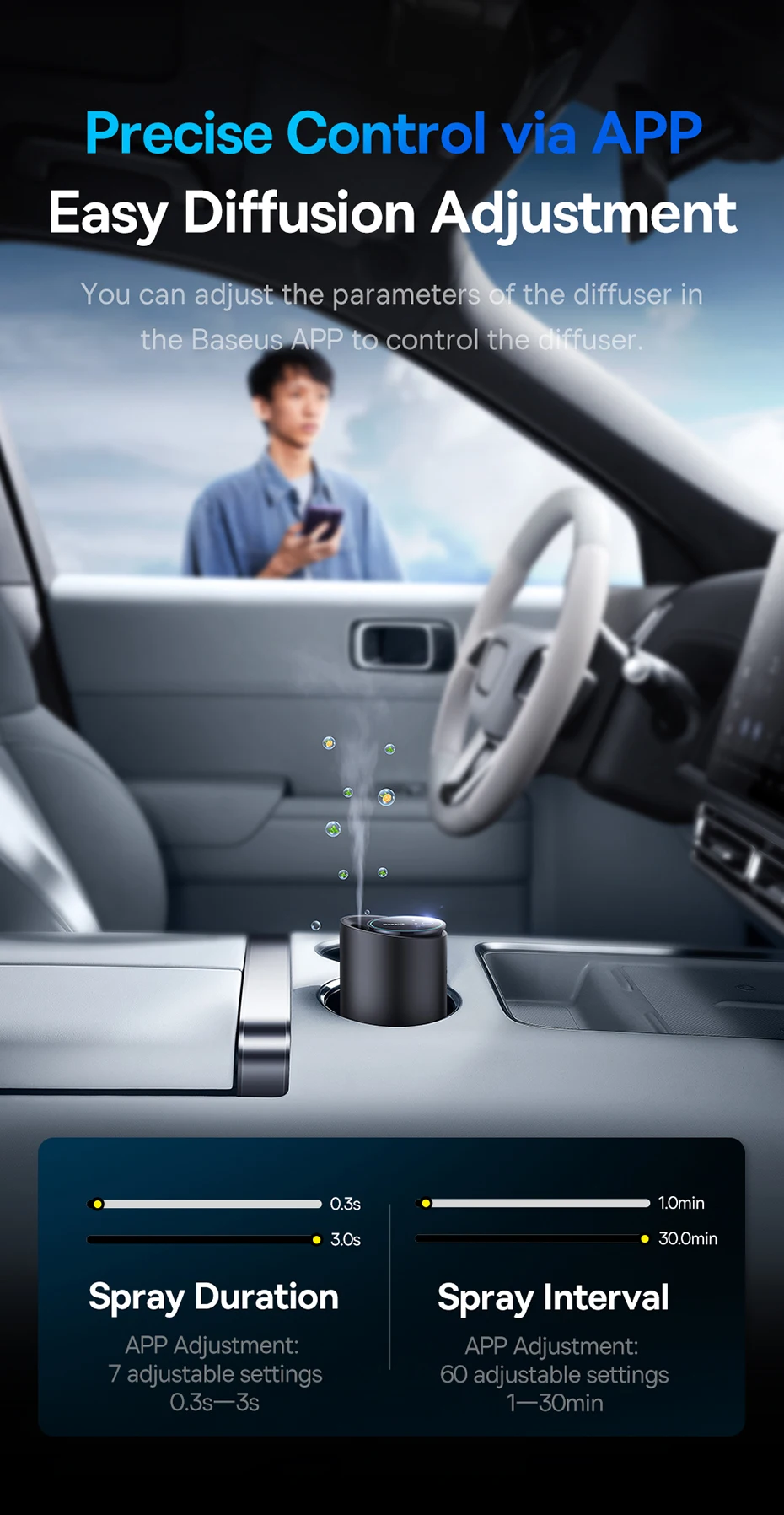 You can adjust the parameters of the diffuser in the Baseus APP to control the diffuser.