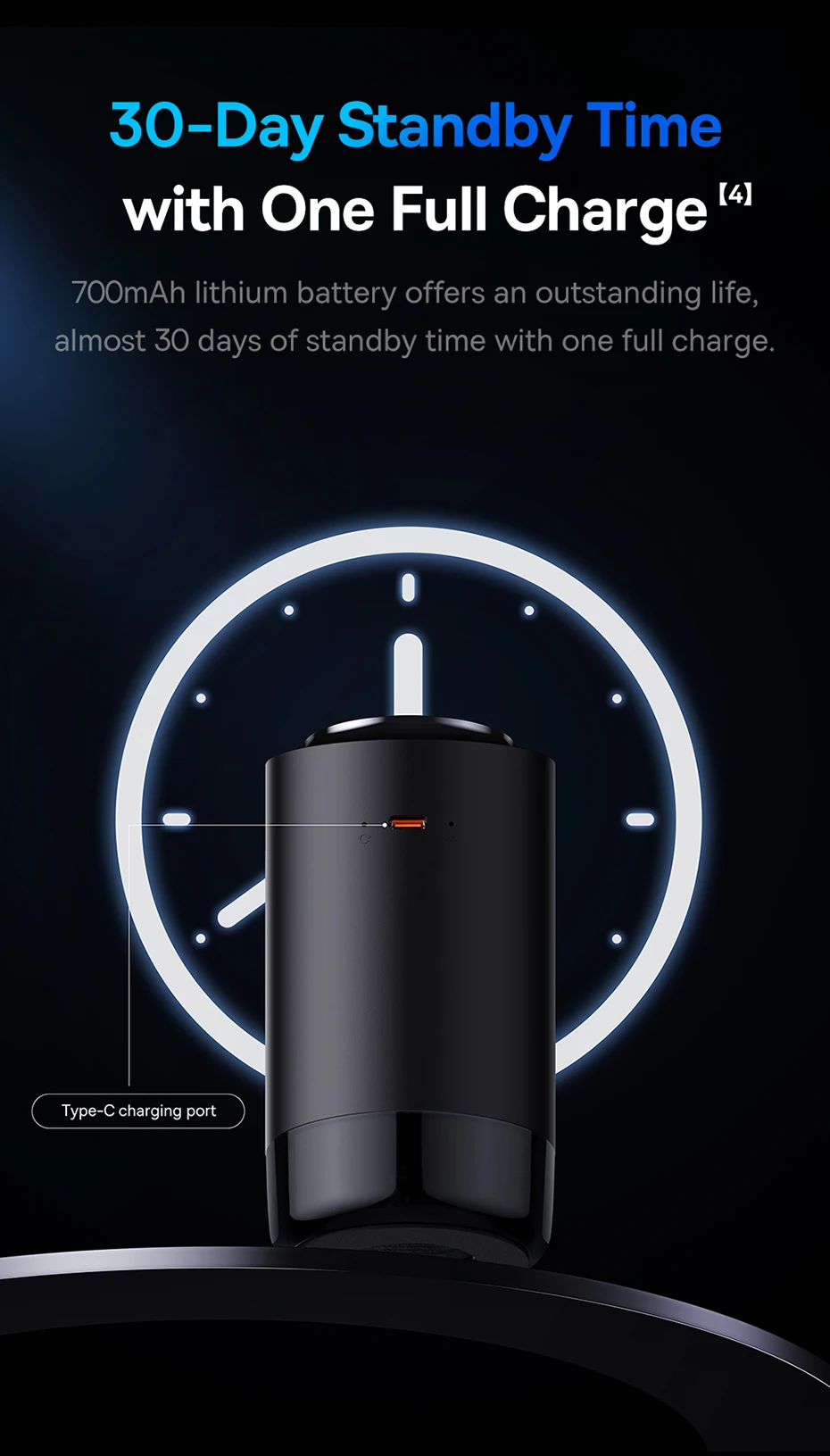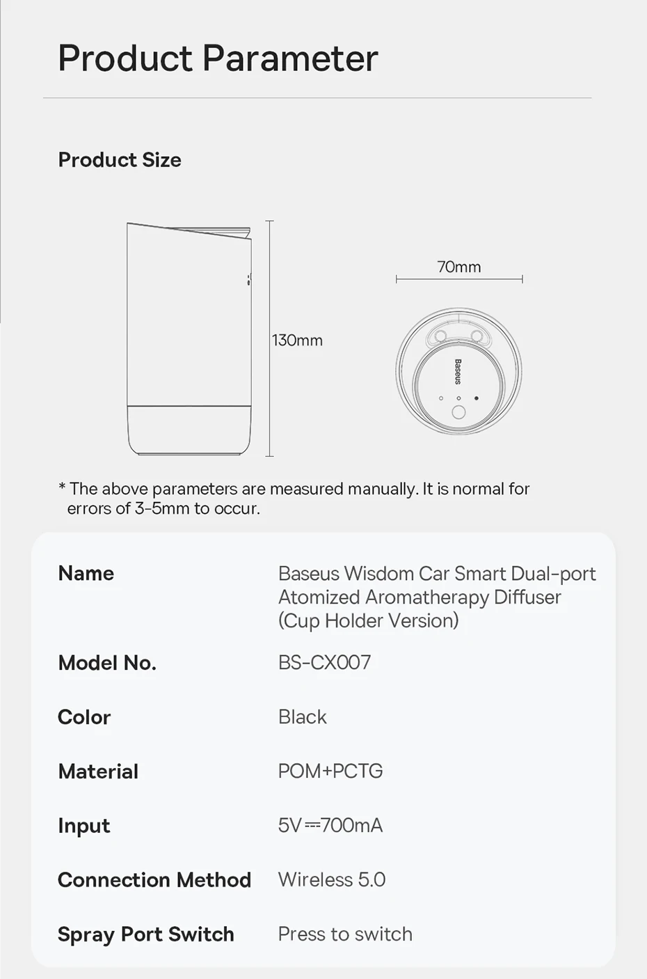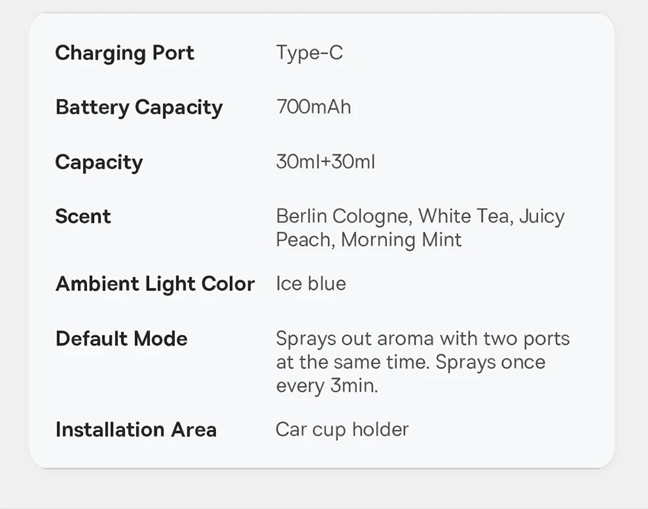 The Baseus Car Air Diffusion Air Freshener is designed with convenience in mind. It weighs only 0.44kg, making it easy to handle and install. Its Type-C 5V input allows for easy charging, and it has a battery capacity of 700mAh, ensuring a reliable and continuous operation.