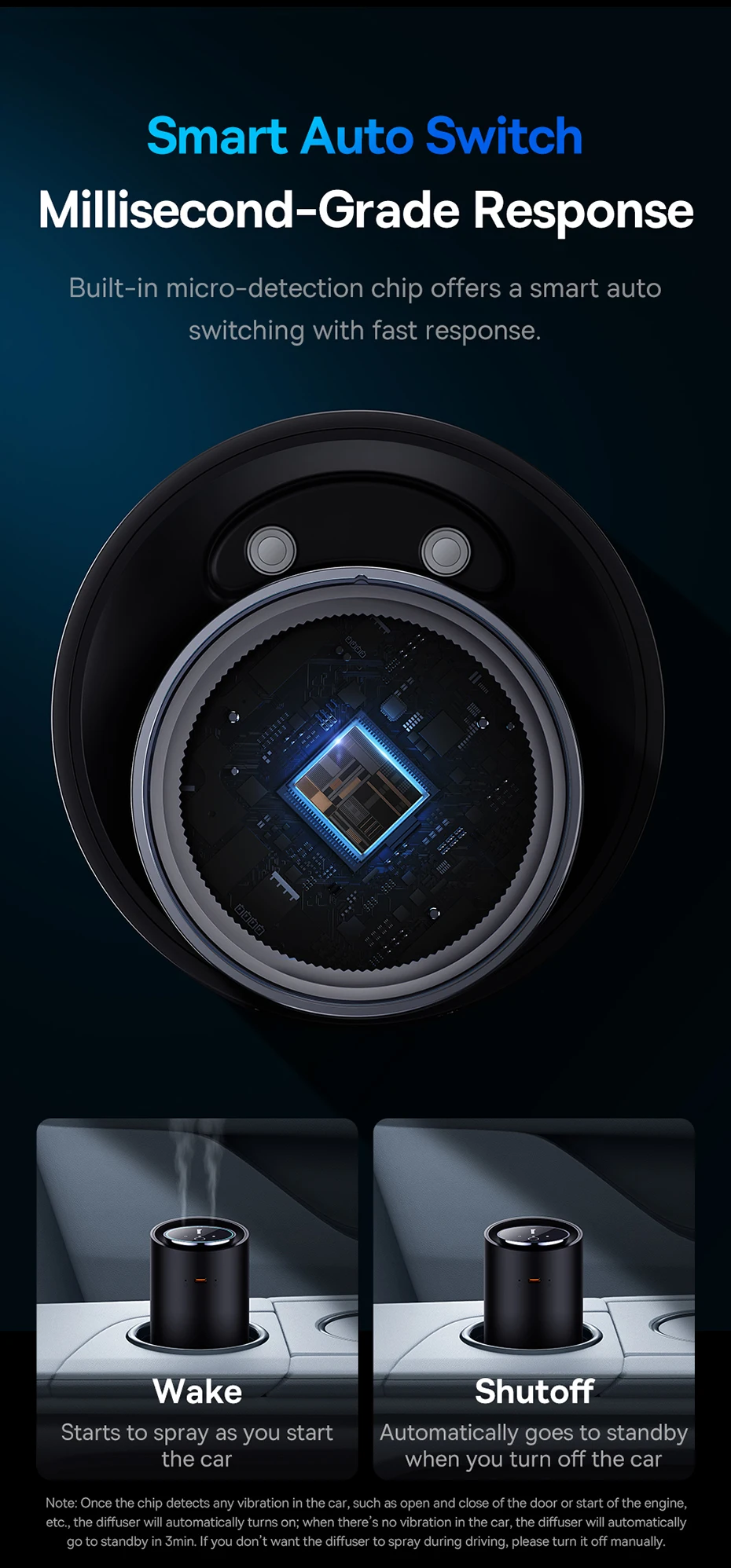 Ultrasonic atomization technology breaks up the molecular structure of the essential oil through high-frequency oscillation and sprays out moist fine mist to fill up the car with fragrance.