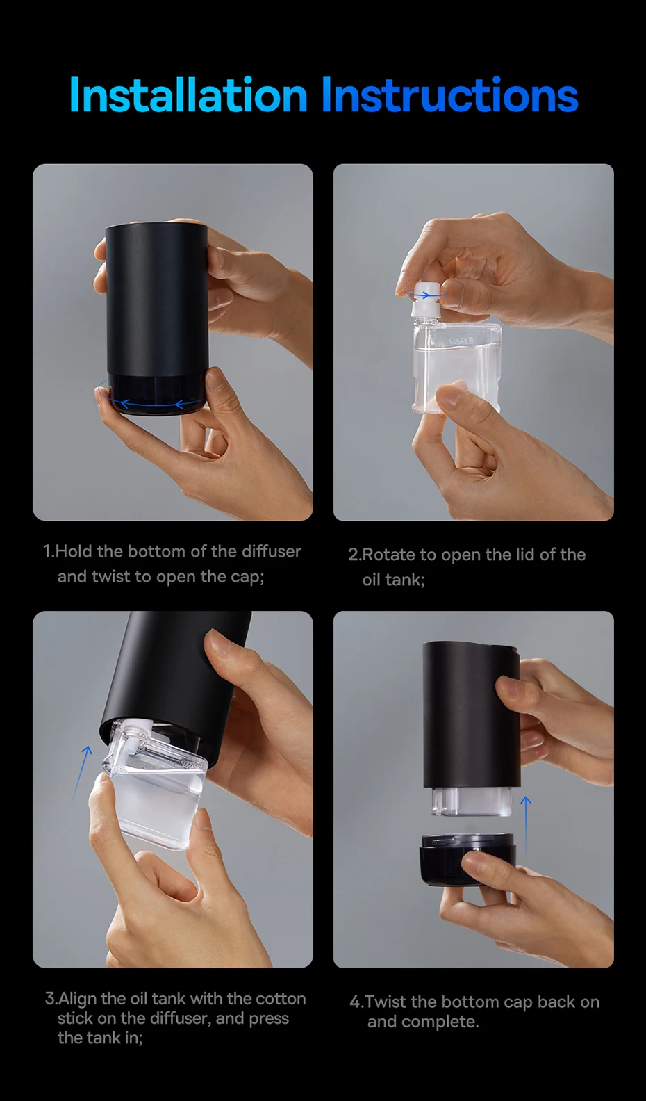 1.Hold the bottom of the diffuser and twist to open the cap;