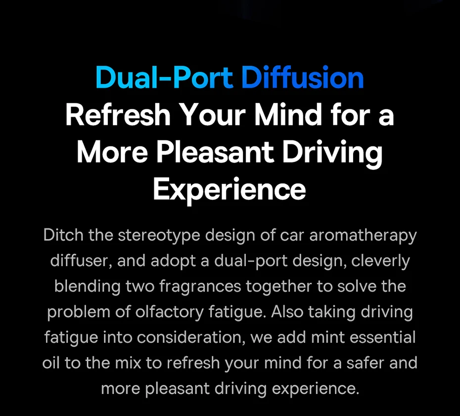 Ditch the stereotype design of car aromatherapy diffuser, and adopt a dual-port design, cleverly blending two fragrances together to solve the problem of olfactory fatigue. Also taking driving fatigue into consideration, we add mint essential oil to the mix to refresh your mind for a safer and more pleasant driving experience.