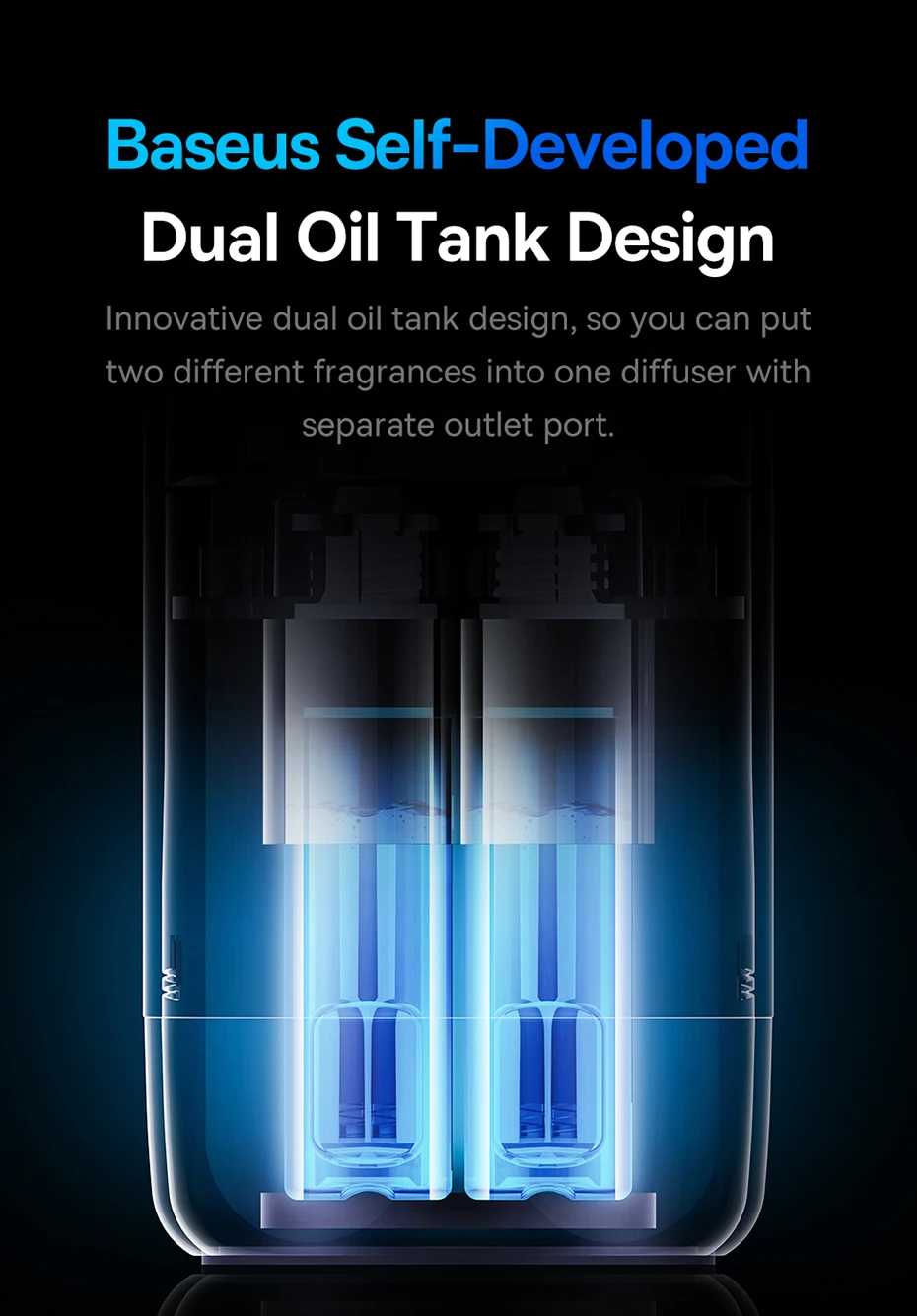 Innovative dual oil tank design, so you can put two different fragrances into one diffuser with separate outlet port.
