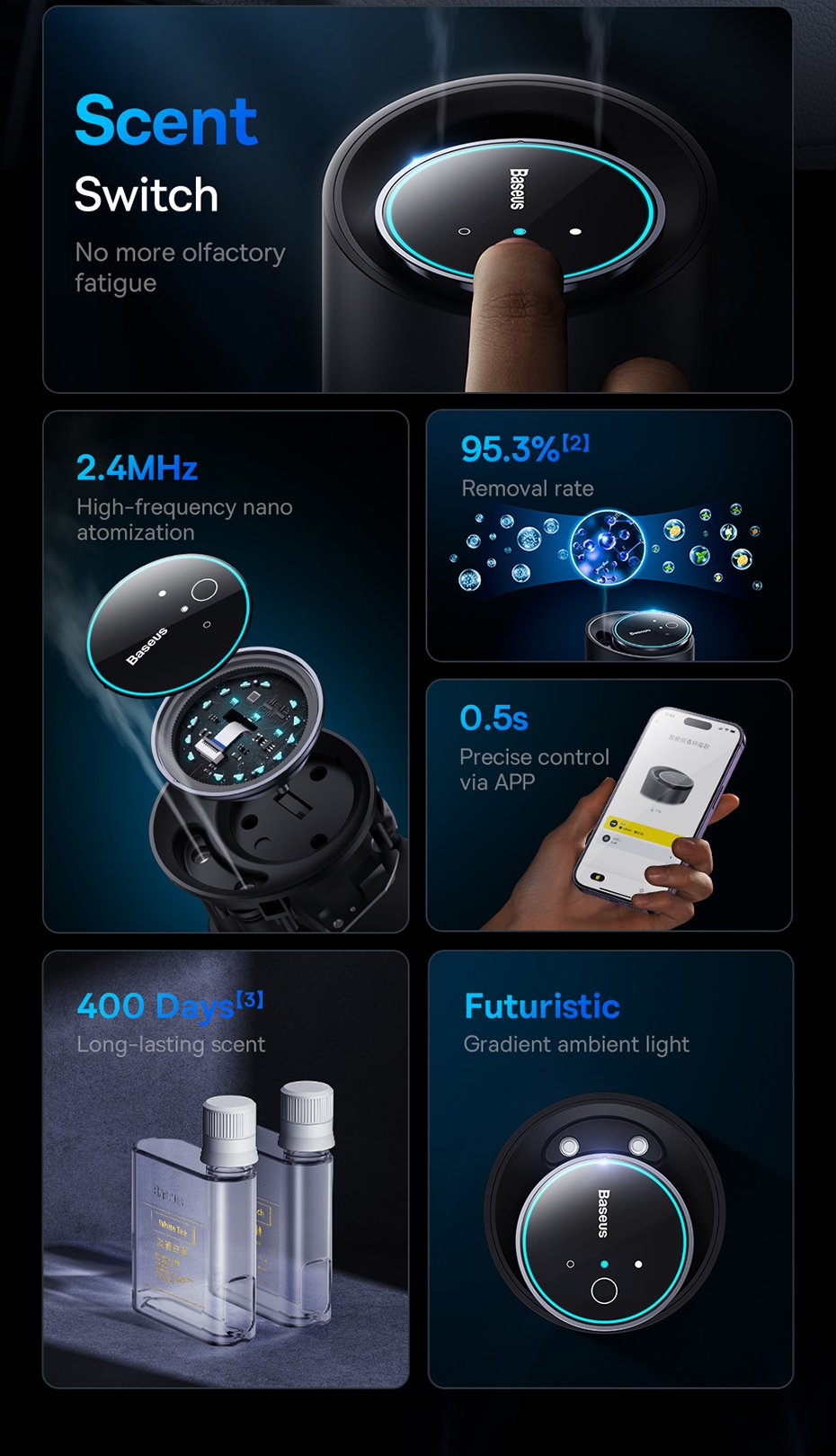 Enhance your driving experience with the Baseus Car Air Diffusion Air Freshener. Enjoy the delightful fragrance, convenient app control, and elegant design it offers. With its compact size and powerful features, this air freshener is a perfect companion for your car journeys.