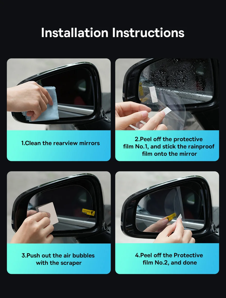 Overall, a car clear rearview mirror rainproof film is a practical accessory that improves driving safety by enhancing visibility and preventing fogging or water droplets on the rearview mirror. It provides a clear and unobstructed view, especially during rainy or foggy conditions, allowing for better situational awareness and safer driving experiences.