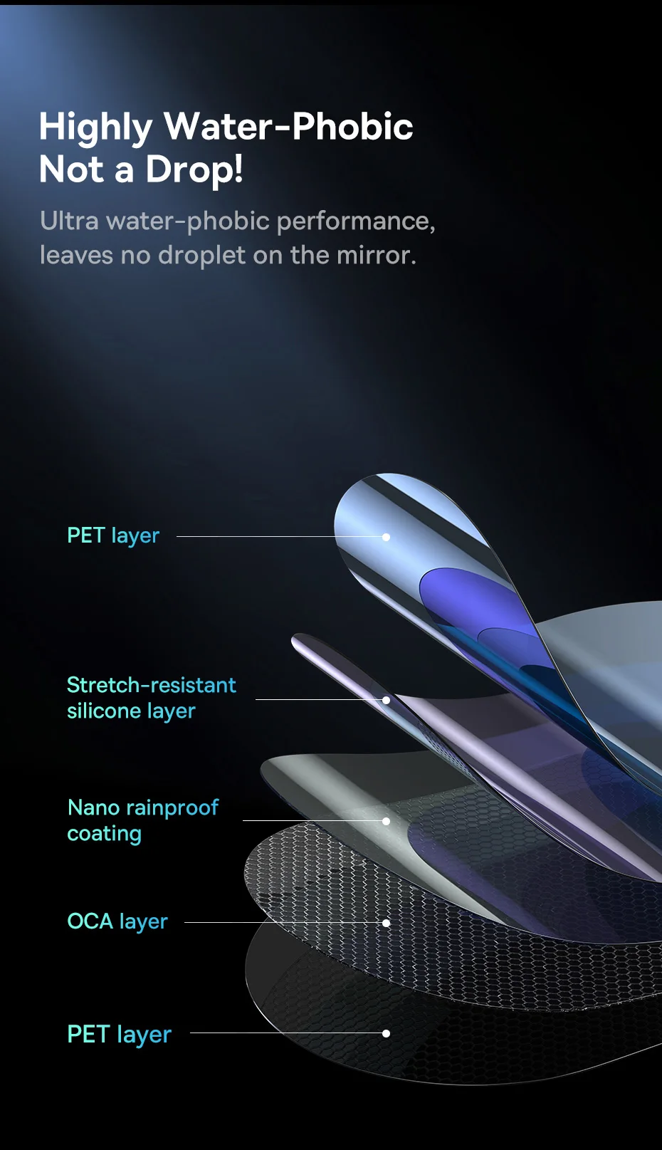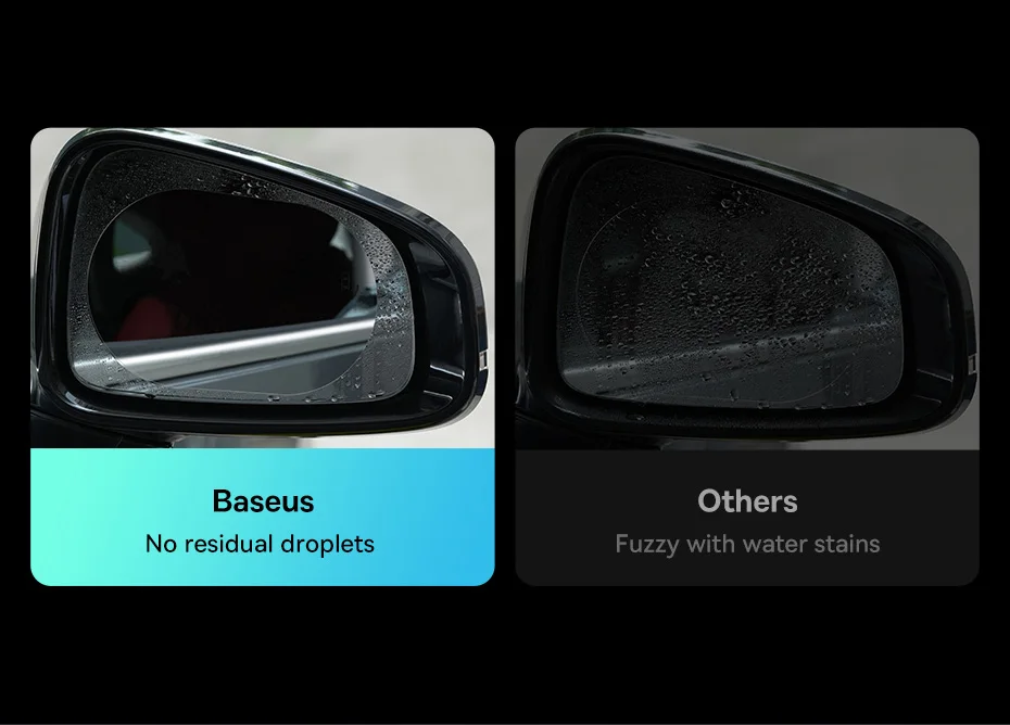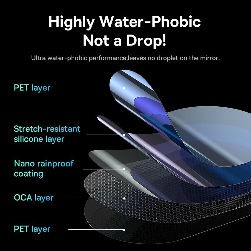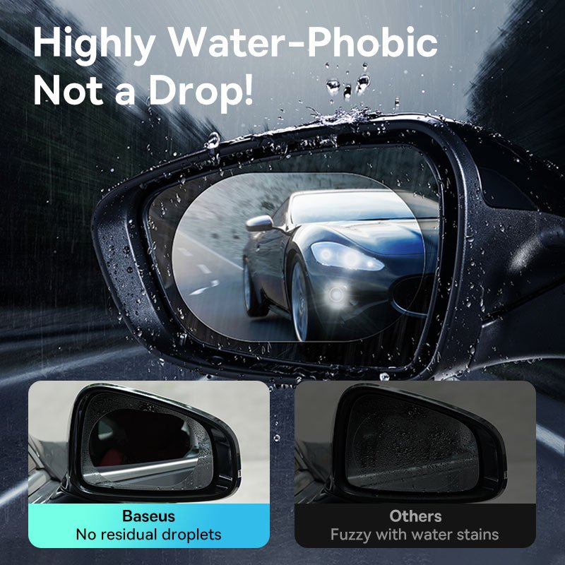 The Baseus ClearSight Rearview Mirror Waterproof Film Clear, Pack of 2, is a high-quality accessory designed to enhance visibility and provide protection for the rearview mirror of your car. This film is made from PET (Polyethylene Terephthalate), a durable and transparent material that ensures long-lasting performance.