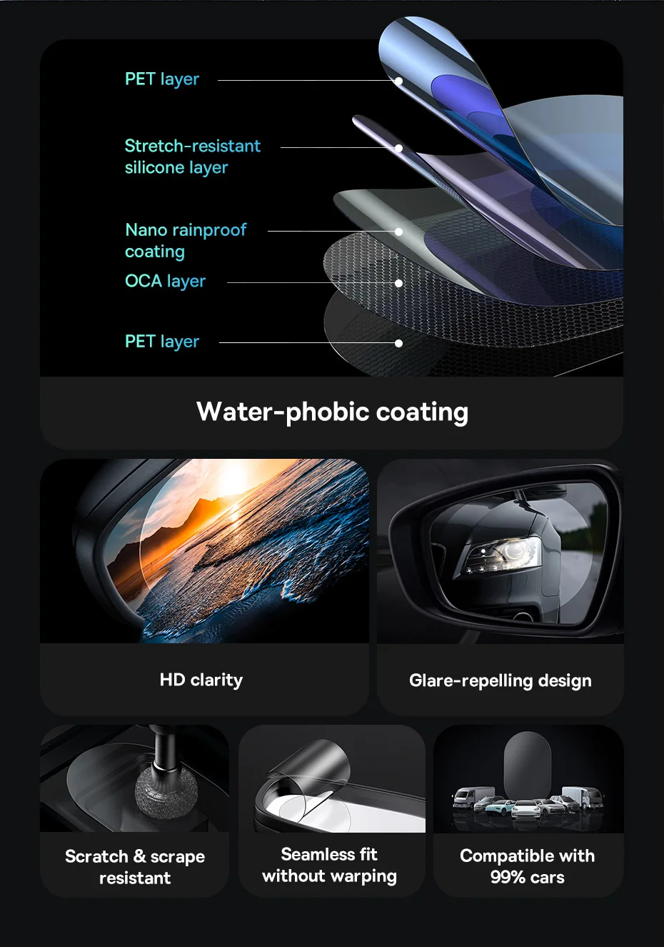 With a size of 95*135*0.27mm, this film is compatible with 99% of cars, making it a versatile choice for various vehicle models. Its sticker placement is specifically designed for the rearview mirror, allowing for a secure and precise installation.